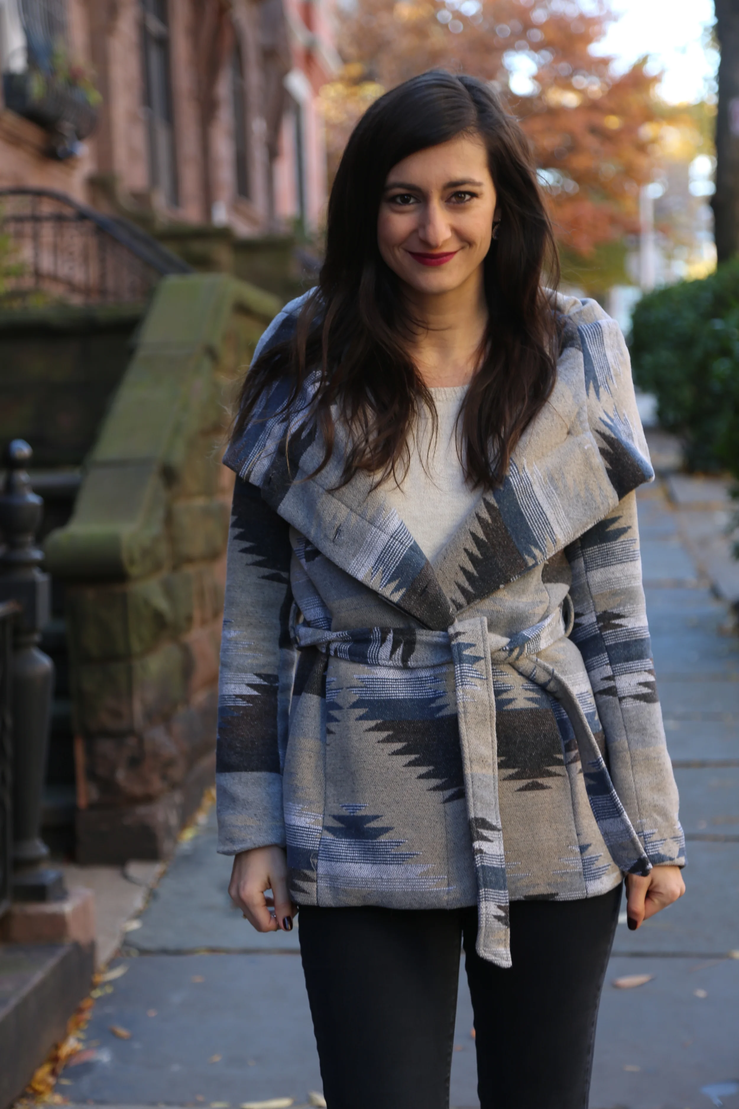 Friends! I had to share all the deets of this statement winter coat with you because it's such a steal! This cute Navajo print wrap jacket is only $39.99 from Target!! Whoa!! Now that's a good deal if you ask me! They have four fun color options (the plaid one is also adorable!) and all have a flattering feminine shape to the fit. I really liked this bold pattern for that cool western style. Plus it's a nice change from my typical black overcoat (read boring). You can dress it up or down (although I like it for casual days with ankle boots). Effortlessly chic!